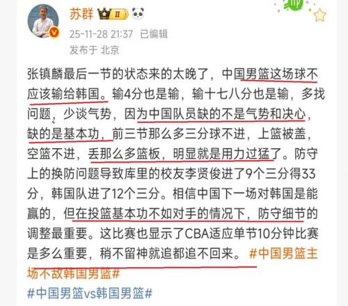 那么,中国男篮输球是什么原因呢?苏群认为最为主要的原因就是基本功不行,在前三节比赛,很多空位三分球都投不进,甚至,面对空篮也是投不进,而且,拥有身高优势,却还丢了这么多篮板球。这说明了什么呢?这充分说明了,中国男篮球员的基本功不行,同时,也说明了,球员在比赛中用力过度。