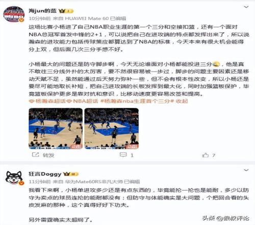 媒体人“海JUN的蓝”发文点评:这场比赛小杨进了自己NBA职业生涯的第一个三分和空接扣篮,还有一个面对NBA总冠军首发中锋的2+1,可以说把自己在进攻端的特点都发挥出来了,所以说瀚森的进攻能力包括传球策应都算达到了NBA的标准,今天本来有很大机会能得分上双,但后面几次三分手感不好。