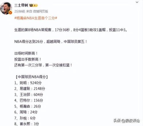 媒体人“三土带刺”发文点评:NBA得分达到26分,超越周琦,中国球员第五!