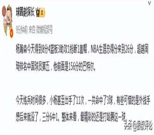 媒体人赵探长发文点评:“杨瀚森今天得到8分4篮板3助攻1抢断1盖帽,NBA生涯总得分来到26分,超越周琦排名中国球员第五,他前面是156分的巴特尔。”