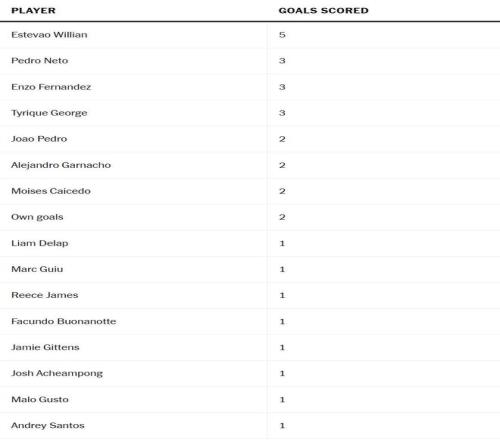 帕尔默在他迄今为止在斯坦福桥完成的两个赛季中都是切尔西的头号射手,2023-24赛季打进25球,2024-25赛季打进18球。马雷斯卡会很高兴地看到,利亚姆-德拉普对阵巴塞罗那打入第三球的利落破门,确保在帕尔默缺席的过去两个月中,已有16名不同的球员(包括乌龙球)取得过进球。他们列在下方。