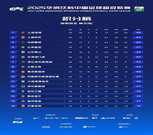 11 月 22 日,2025 赛季中超联赛第 30 轮 8 场比赛同步鸣哨,这场堪称近年最刺激的中超收官日,将冠军归属、降级名额、金靴之争、亚冠资格四大核心悬念全部推向终点。上海海港客场 1-0 轻取大连英博,以 66 分惊险卫冕,豪夺中超三连冠。成为继万达、恒大后,中国顶级联赛第三支获此殊荣的俱乐部。队史第四座中超冠军,与山东泰山相差一个冠军。虽于客场以 3 - 0 之姿大胜天津津门虎,上海申花却仍因两分之差,与冠军失之交臂,只能屈居亚军,遗憾踏上亚冠二级联赛的征程。